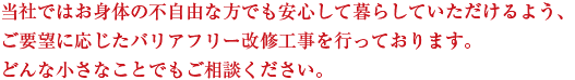 浴室や玄関・廊下・トイレなどではちょっとした段差も、つまずき・転倒の原因になってきます。 家族全員が安心して過ごせる空間をご提供します。